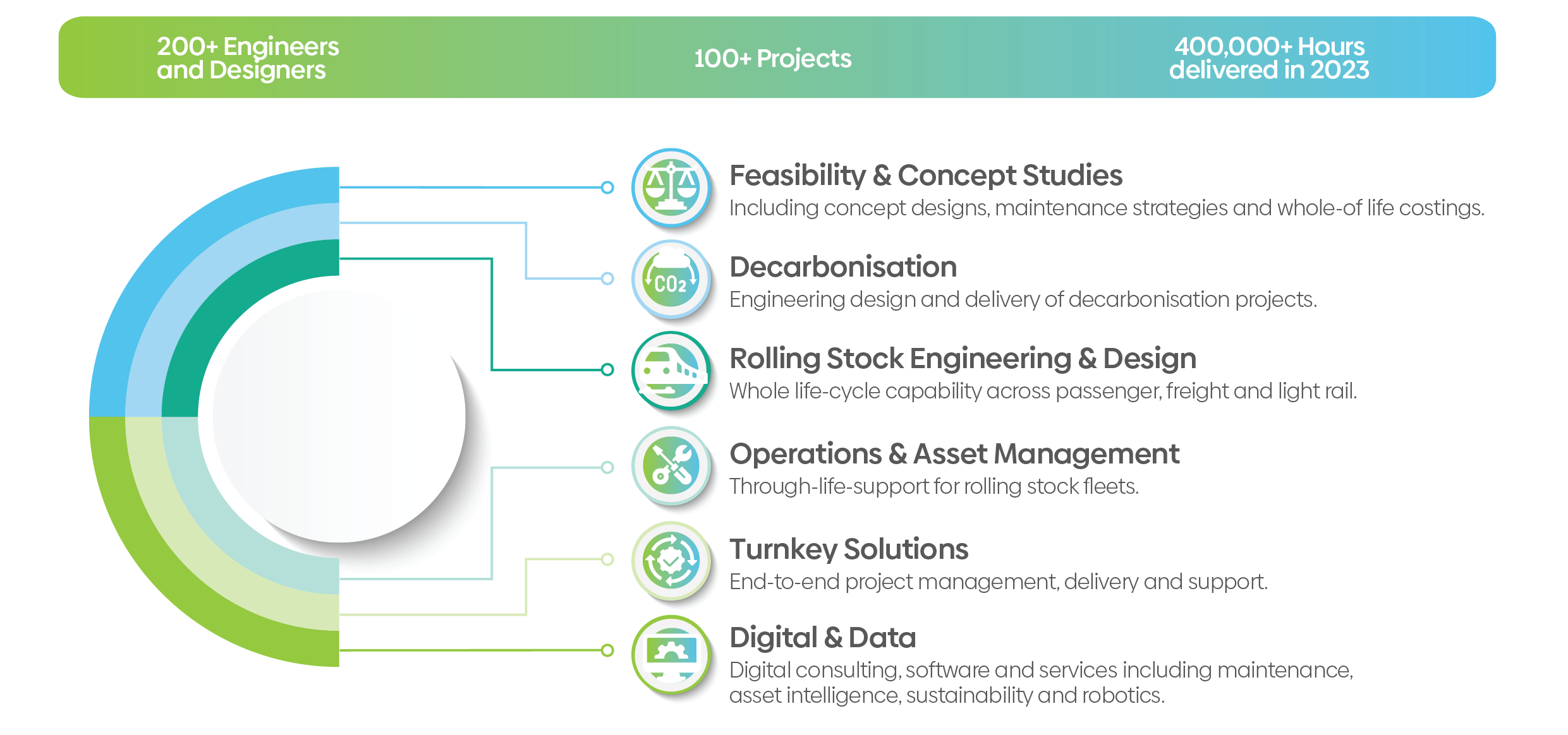 우리는 기술 철도 서비스 분야에서 검증되고 신뢰받는 이름입니다. 컨셉부터 운영까지 우리는 여객철도, 경전철, 화물/중량물 운송 등 호주 철도의 운행을 유지하는 결과를 제공합니다.