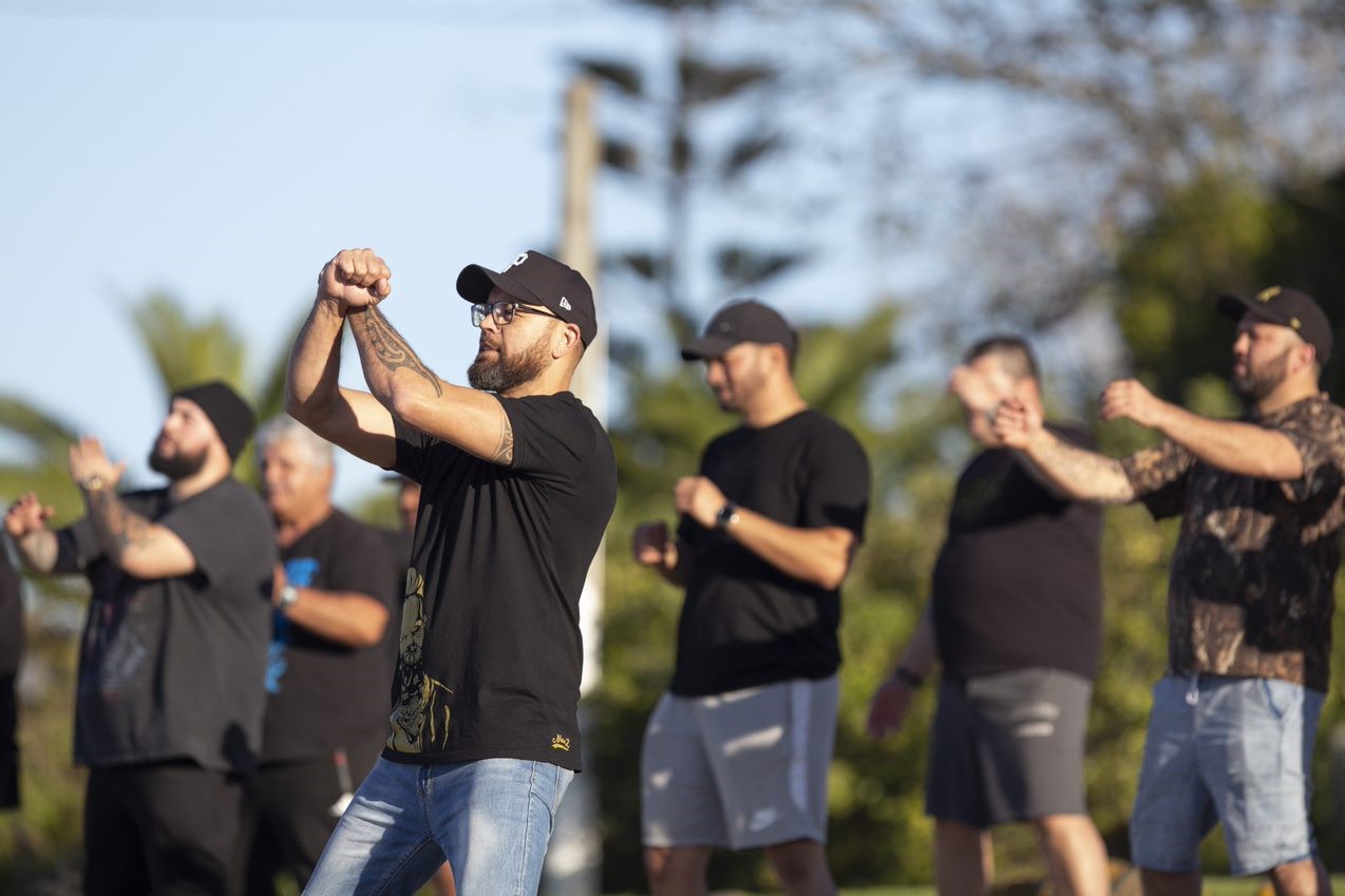 Te Ara Whanake(마오리 리더십 프로그램)의 전경에 있는 Jarrod - 오클랜드의 Umupuia Marae에서 온라인슬롯사이트 하카를 가르치고 있습니다.